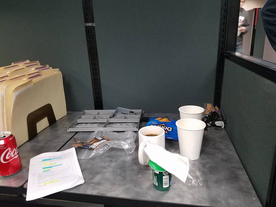 Now, about those meals, snacks and drinks! I think most people are familiar with the concept that film/tv sets have Craft Services. Although I never had an official word on it, I assumed that it was more beneficial for production to provide food as to make it easier for everyone to break and be back on set in a short amount of time, as well as relieving everyone of one more thing to be responsible for while working such long hours. The cast and crew were provided each day with breakfast, served 15 minutes before first call time. Then approximately six hours into our day, lunch would be served and we’d have a half hour break. We were fortunate to have a breakroom in the building we were using as our closed set, which served as our food area as well as a smaller meeting room. The great thing about Crafty (slang for Craft Services) is that not only does it provide meals, but also all kinds of snacks and beverages (non-alcoholic, of course!) available throughout the day. Hour 10 and you need a sugar rush? No problem… chocolate or energy drink at your service. Freezing cold on a location night shoot? Not to worry! Hot coffee, cocoa and tea available… have car trunk, will travel! And the special treats like the hour 14/10:00 pm Jimmy John sandwiches were totally awesome! The meals and snacks were wonderful, but I have to admit… by the end of the three weeks, I was getting really tired of being a glutton. If I never saw a mini Snickers, a York Peppermint Pattie, or some beef jerky for a while, I’d be ok. Even the meals, as good as they were, got a little bit much. Funny how things work like that, isn’t it? Too much of a good thing. All in all though, it was a wonderful perk. As for the photo on the right… I didn’t manage to get a pic of our spread of food in the breakroom. Usually too busy eating I suppose, LOL! But, this photo was taken in the cubicles where we were filming. Some extra file folders (very pertinent to the script of our film!), my highlighted sides, and my Coke can, along with a few cups filled with coffee or tea (Rick’s drink of choice), chips, yogurt, energy bar, and miscellaneous wrappers and gaffers tape. As I recall, this was mid-filming day.