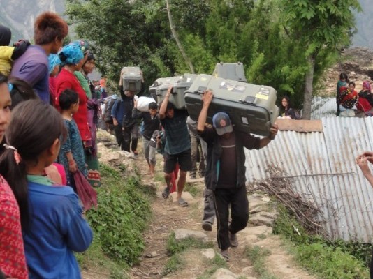 Traveling through Nepal took a bit more time as organization on the ground was more sketchy due to the chaos the country was under from the events. After a couple of days delay, a helicopter flight was secured out of Kathmandu. Once on the ground again, the team pushed forward, hauling their equipment and supplies on their backs as they finally reached the area where they were to set up camp.