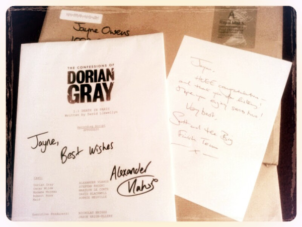 ** Edited to add: Recently I submitted a question for Alex in a contest at Big Finish featuring his Dorian Gray series. My question was selected and he answered via a video response! HERE IS THE LINK to the video on the Big Finish Facebook Page! I also won a signed script of the This World Our Hell episode! Bit of trivia, the script was originally titled Death in Paris!